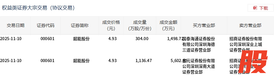 11月10日,韶能股份大宗交易成交1440.47万股,成交额7101.52万元,占当日总成交额的41.52%,成交价4.93元,较市场收盘价5.41元折价8.87%。