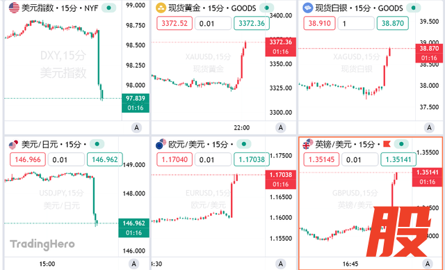 美元指数继续回落,跌至98下方,日内跌超0.7%。现货黄金突破3370美元/盎司,日内涨超1%。现货白银日内涨超2%,逼近39美元/盎司。